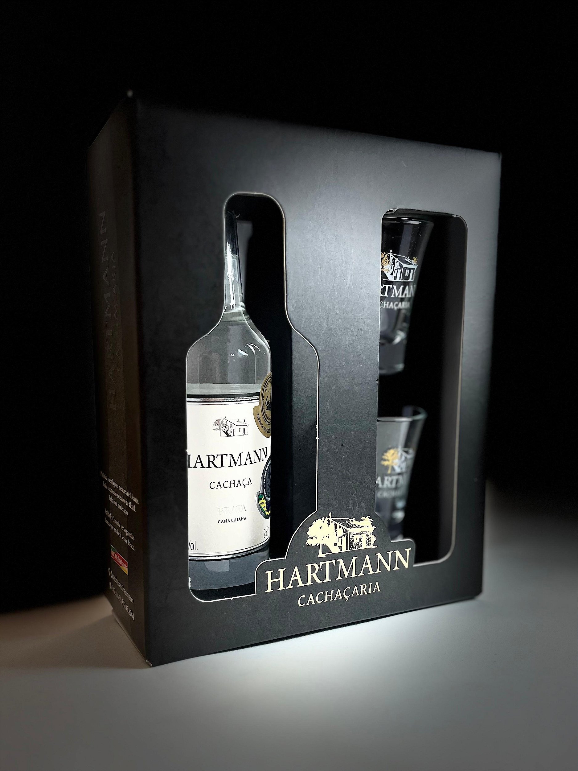 O Kit cartonado Prata Hartmann reúne a tradicional cachaça prata de 255 ml e 2 copos de dose em uma caixa cartonada premium, com acabamento impecável e apresentação que encanta no primeiro olhar.